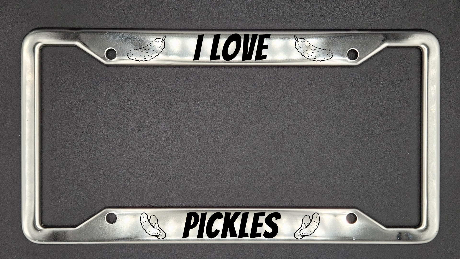 Elevate your car's personality with the delightful I Love Pickles Metal License Plate Frame. This eye-catching accessory is perfect for pickle enthusiasts, proudly showcasing your love for this tangy delight with charm and character.