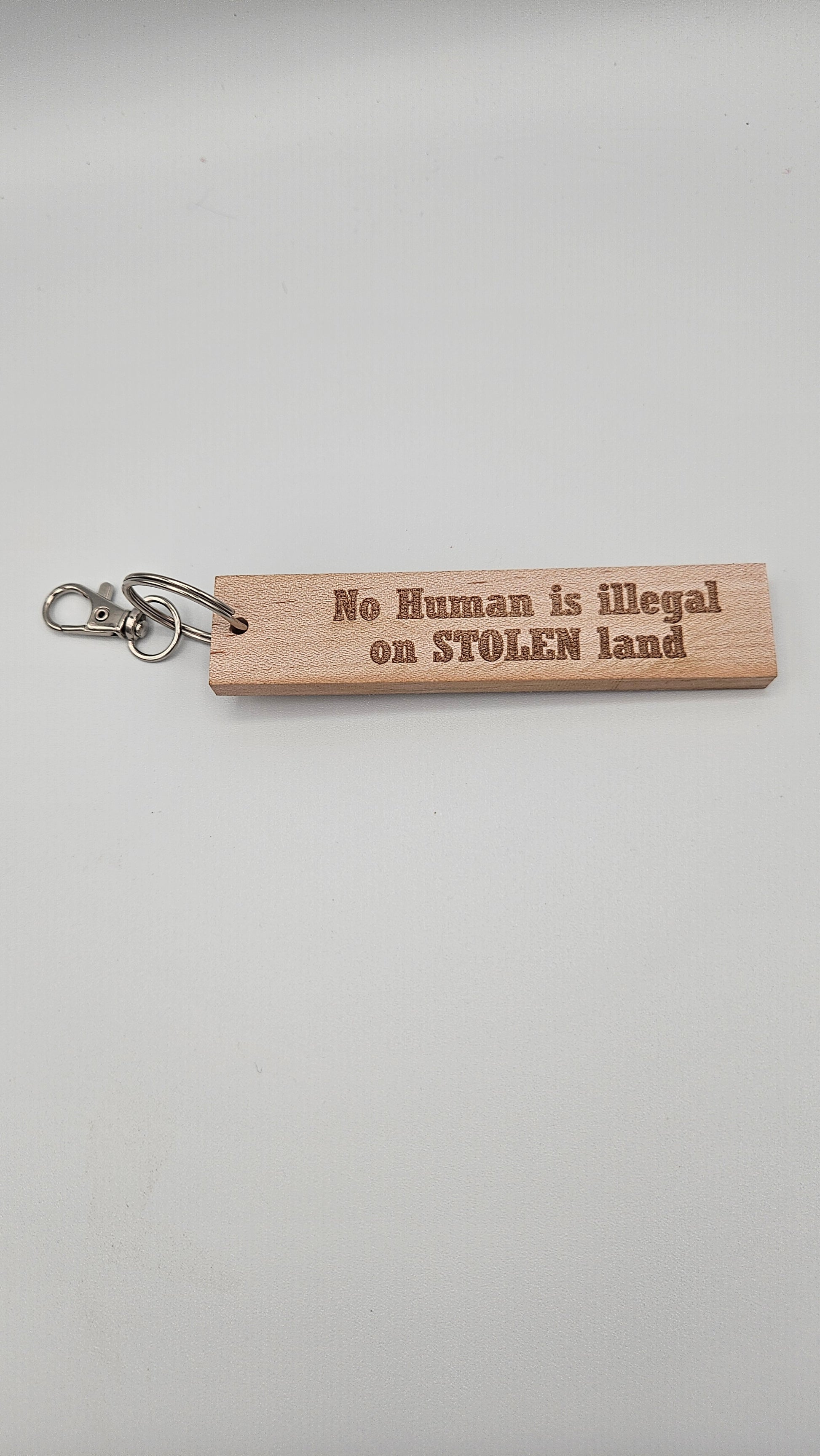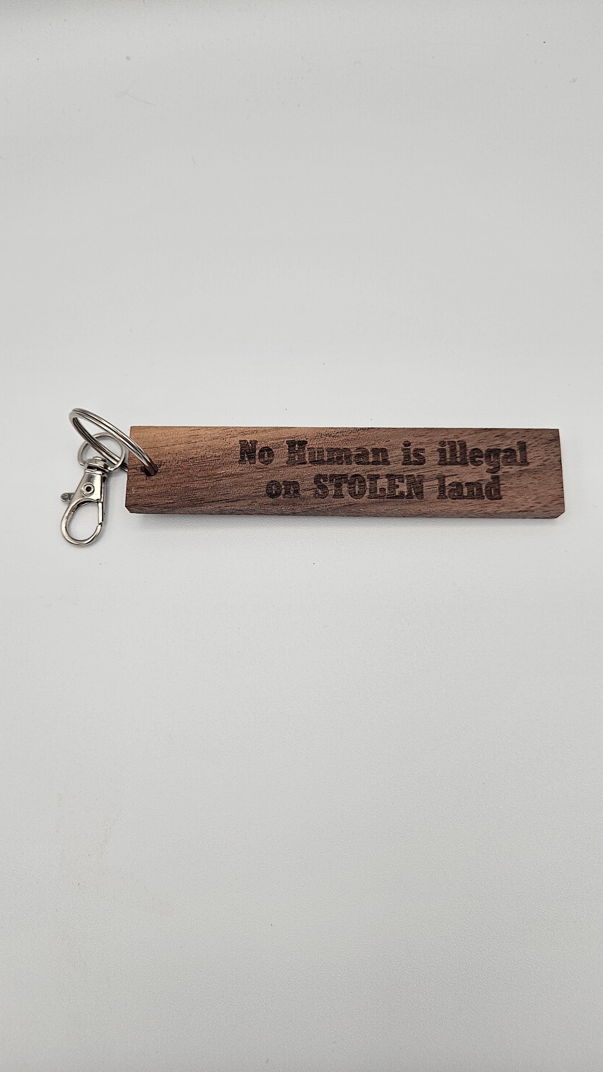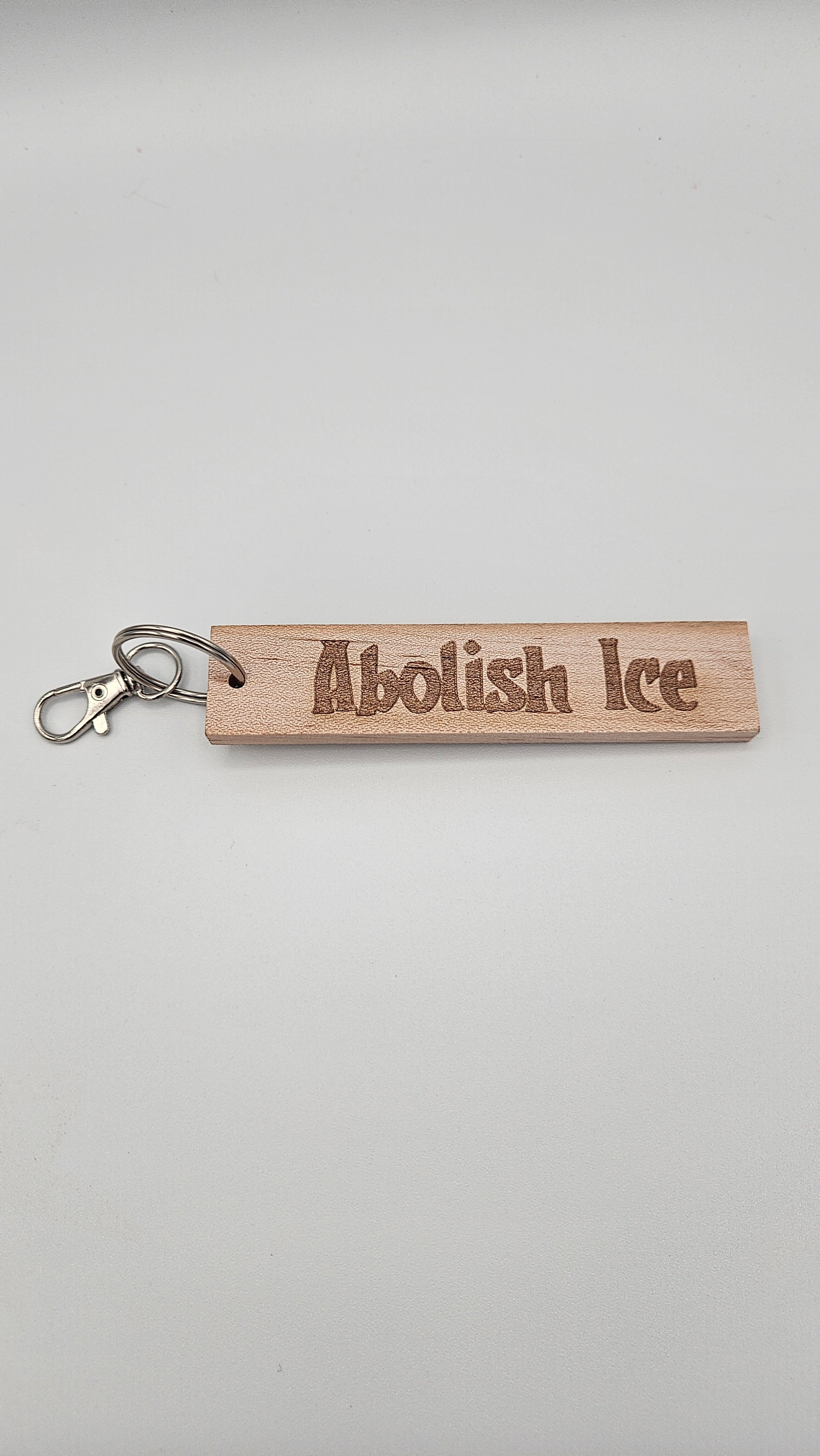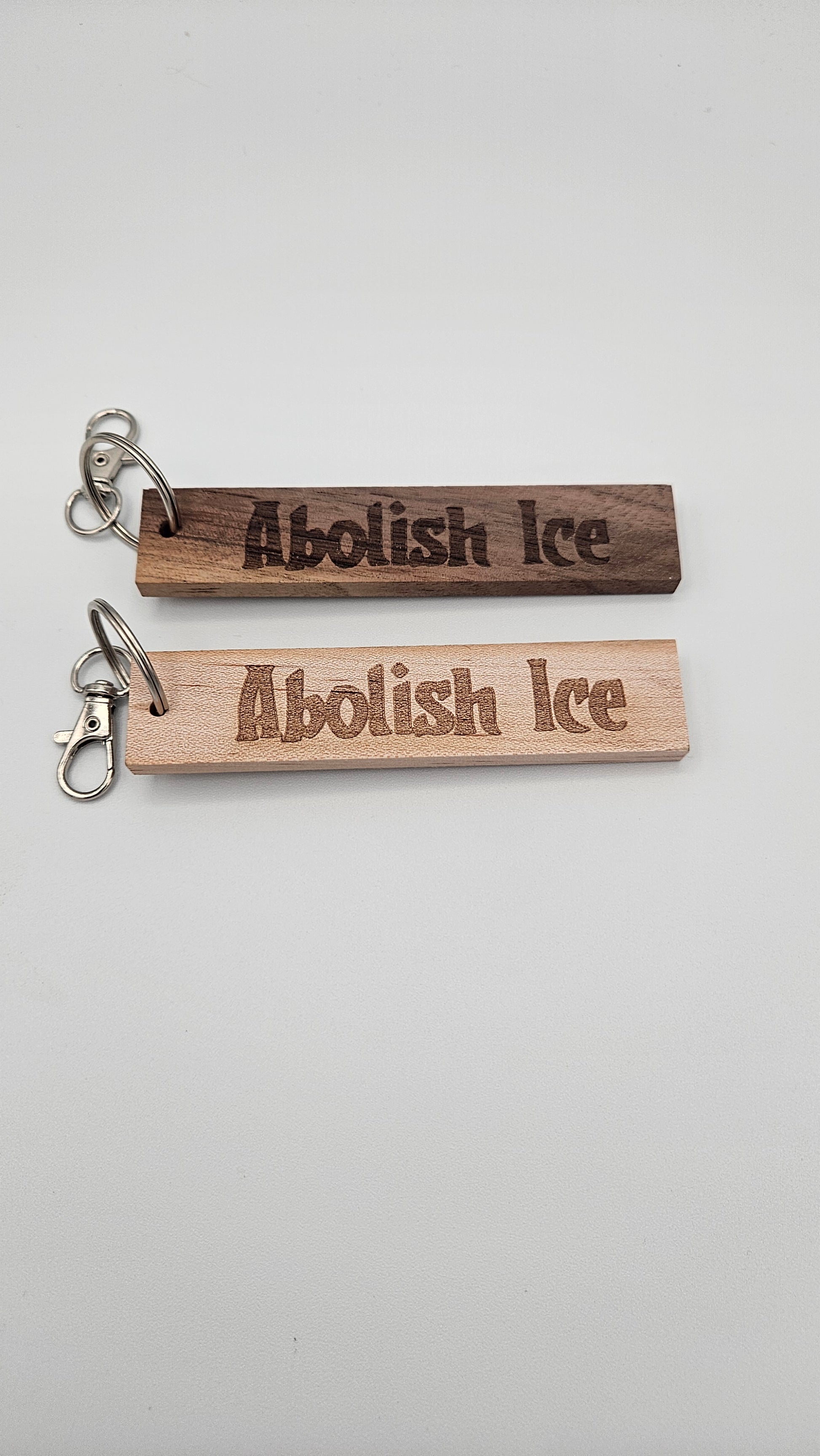 Send a message while also contributing to a cause. With each sale, we will be contributing $2 to the American Civil Liberties Union (ACLU) to help fight the Trump administration's policies. Featuring a laser-engraved "Abolish ICE" message on one side and "No human is illegal on STOLEN land" on the reverse. This 1 inch by 4 inch keychain comes with a keyring and clip for easy attachment. Use as a keychain or a bag charm. Available in Black Walnut or Maple.