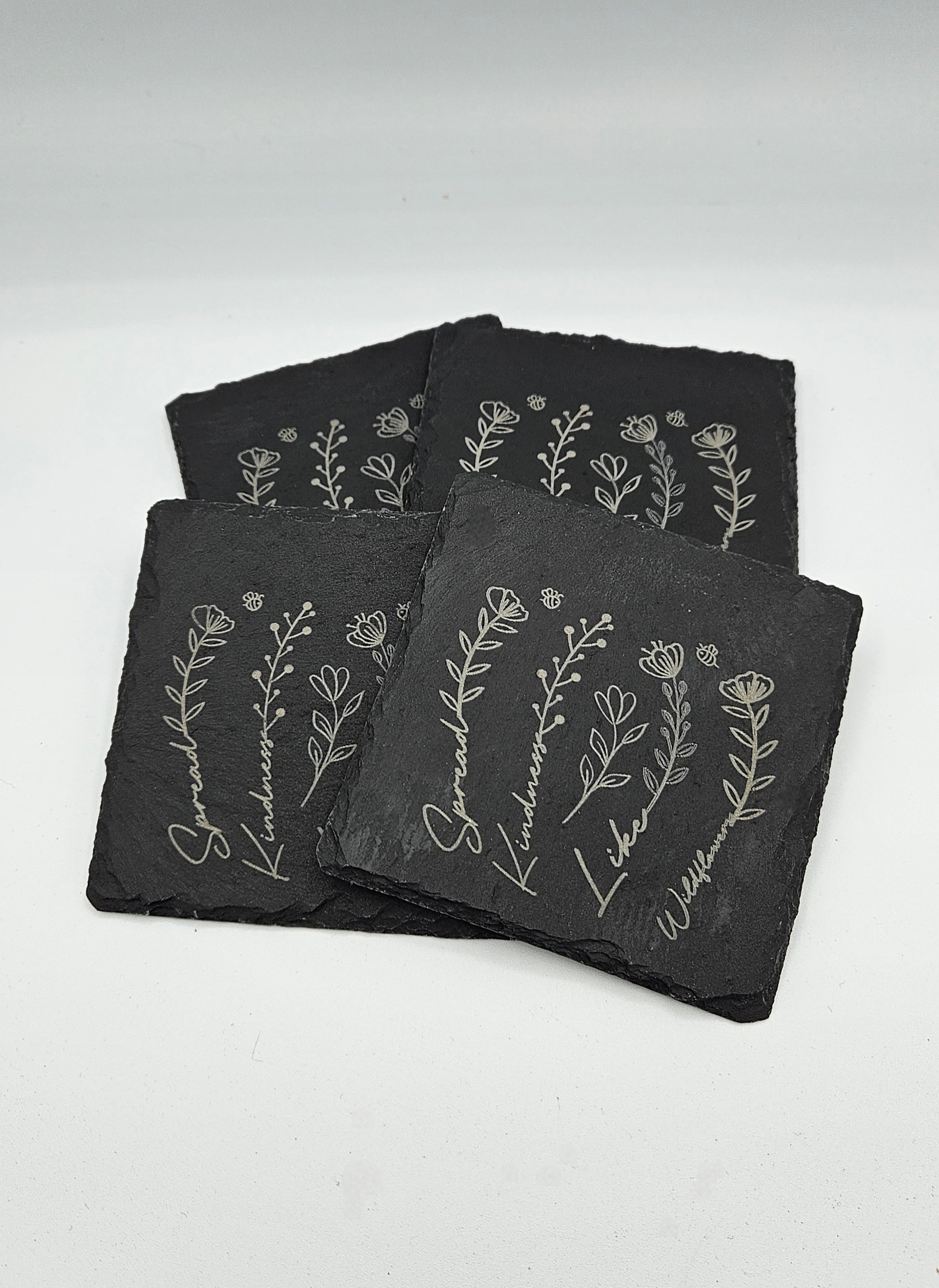 Protect your surfaces while spreading positivity with this beautiful slate coaster set. Each 4-inch square coaster features an intricate laser-engraved design of wildflowers blooming from the inspiring words "Spread Kindness Like Wildflowers." This set of four comes complete with an elegant metal holder, making it perfect for your coffee table, nightstand, or as a thoughtful gift. Foam feet keep your furniture safe from scratches and water rings. A functional piece that brings both style and meaning to any room.